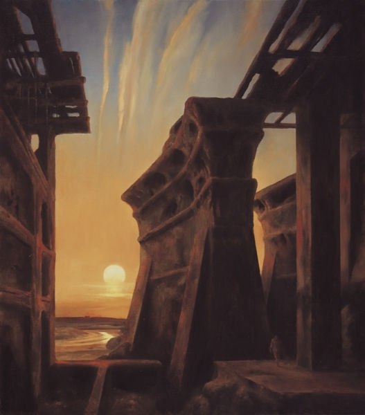 Although Rick Amor cannot in this context be categorised as a ‘New Romantic’, he remains one of the most highly regarded and important Romantic Australian artists of the last 100 years. Amor's paintings are imbued with potent symbolism and a majestic, poetic quality. Amor's play with light and shadows and his meticulous, draftsman-like use of depth of field in his paintings - particularly in his urban landscapes - bring a sense of tension, disquiet and mystery that intimates an array of meanings.